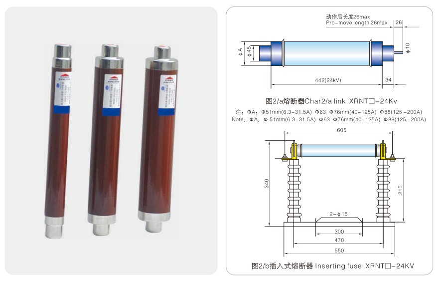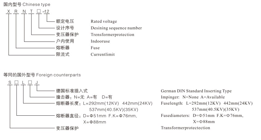 Modèle Tension nominale Un(kV) Courant nominal de fusion In(A) Taille du tuyau de fusion①xC(mm) Remarques